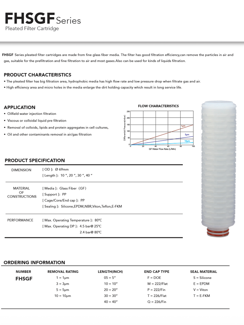 • The pleated filter has a large filtration area. Hydrophobic media offers a high flow rate and low pressure drop when filtering gases and air.