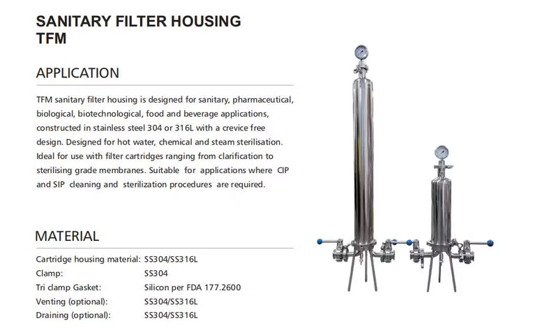 Liquid filter housing made of SUS304 or SUS316L stainless steel, equipped with a pleated filter cartridge as the filter element, can be used for liquid and gas filtration. It features fast filtration speed, minimal adsorption, no media falling off, no leakage, acid and alkali resistance, corrosion resistance, easy cleaning, and back-washing capability. These are ideal filtration devices for industries such as biomedicine, electronics, brewing, beverages, chemicals, and water treatment.