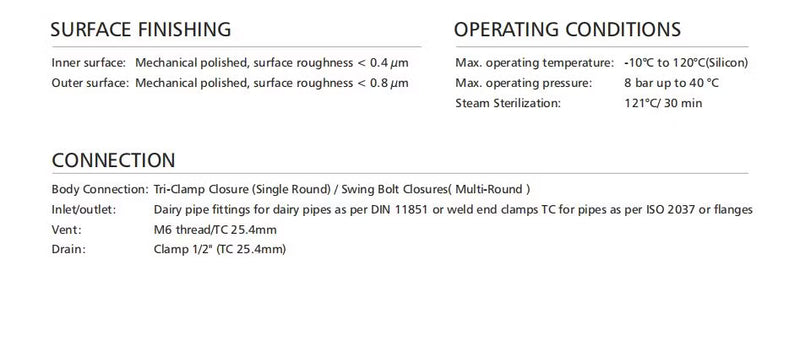 - Internal and external surfaces are mirror-polished to meet sanitary standards.